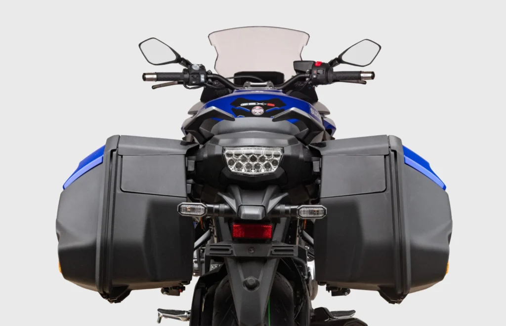 Dentro de esta misma zona del catálogo aparece la GSX-S1000GX, que representa el enfoque crossover de la marca. En su caso, Suzuki mezcla confort, versatilidad y una presentación algo más sofisticada. El equipamiento incluye también escape Akrapovic, asiento premium, puños calefactados, pantalla baja ahumada y el sistema completo de maletas laterales con sus diferentes elementos de montaje y protección. Es una propuesta pensada para usuarios que alternan desplazamientos cotidianos con viajes más largos y que valoran una postura de conducción cómoda sin renunciar a un componente dinámico. Su precio financiado se sitúa en 19.029,18 euros, con cuotas desde 195 euros al mes.