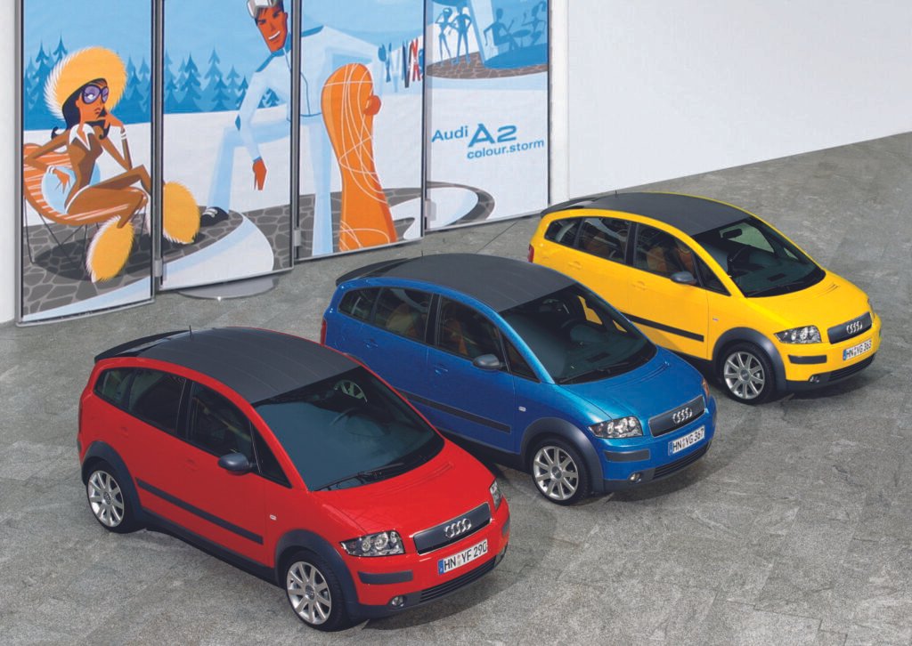 En 1999, Audi presentó en el Salón de Frankfurt un modelo que dividió opiniones: el A2. Su carrocería fabricada íntegramente en aluminio lo convertía en un compacto ligero, con solo 153 kilos de estructura y un diseño pensado para maximizar la eficiencia aerodinámica. Con 3,83 metros de longitud y una altura de 1,55 metros, ofrecía un habitáculo amplio en relación a su tamaño. Se produjo en Neckarsulm hasta 2005, con un total de 176.377 unidades fabricadas.