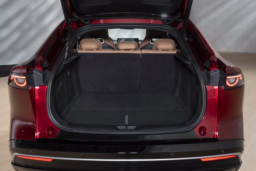 El exterior del Mazda 6 e mantiene la esencia del lenguaje de diseño “Kodo – Alma del Movimiento”, característico de la marca, pero adaptado a su naturaleza eléctrica. Las líneas fluidas y la robustez de la parte trasera se combinan con una parrilla frontal iluminada que también indica el estado de carga de la batería. En la parte posterior, los grupos ópticos con cuatro cilindros acentúan la horizontalidad, aportando un toque distintivo. El maletero, con una capacidad de 330 litros, se extiende hasta 1,074 litros al abatir los asientos traseros, mientras que un compartimento delantero adicional de 70 litros aumenta la practicidad del vehículo.