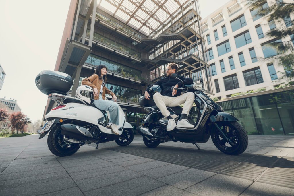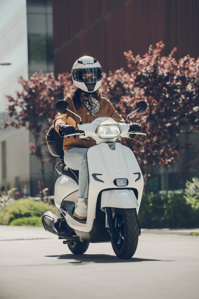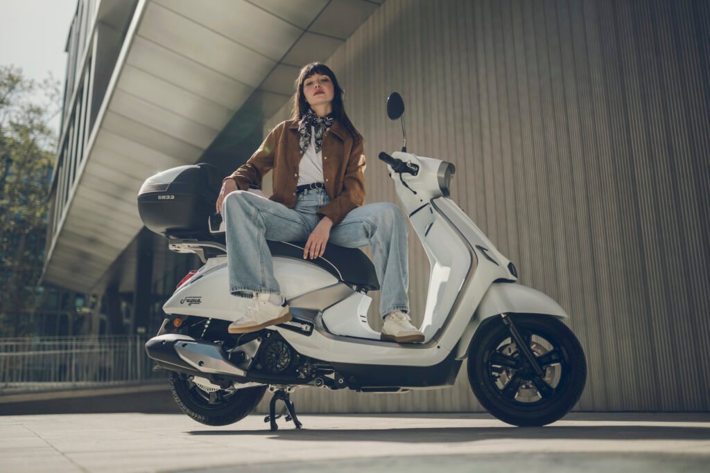Disponible en colores blanco, gris y negro mate, la carrocería adopta un esquema bicolor rematado con molduras cromadas y un top case a juego, incluido de serie. Estos elementos no solo refuerzan su estética urbana, también mejoran su practicidad diaria.