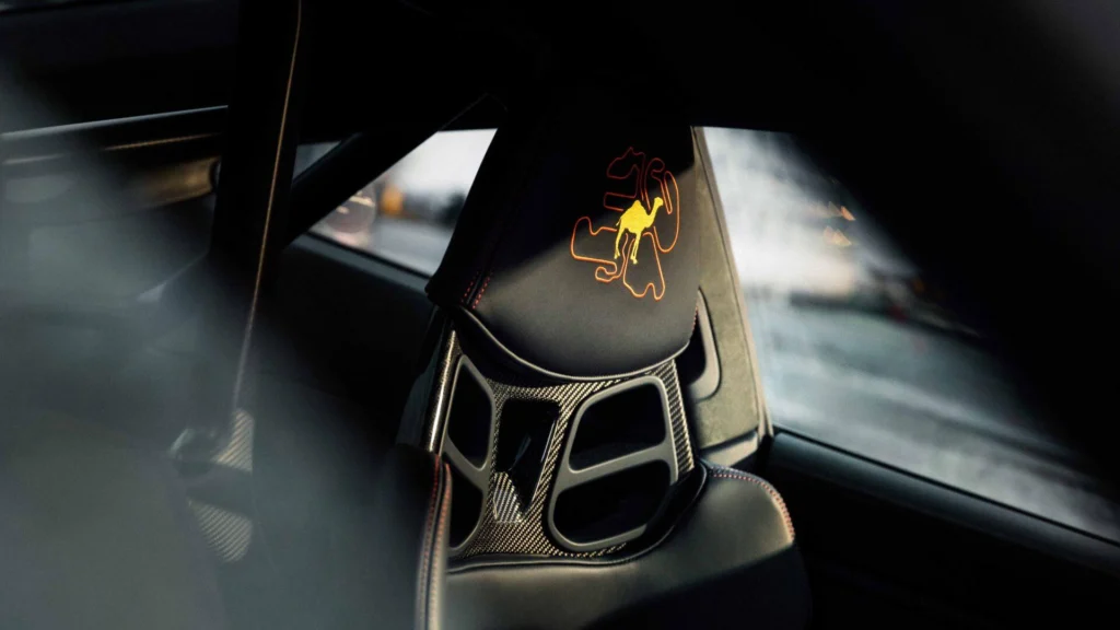 El interior también recoge numerosas referencias a la historia del modelo original. Porsche ha incorporado detalles que evocan el Camel GT Challenge y varios de los circuitos donde corrió aquel 911 S/T de los años setenta. Esos guiños aparecen en los reposacabezas bordados a medida, en molduras interiores, en los umbrales de las puertas y en el relieve de la tapa del compartimento de la consola central. También el proyector de las puertas muestra en el suelo un motivo alusivo al camello histórico, aunque reinterpretado para este contexto actual. Porsche deja claro así que el homenaje existe, pero adaptado a un coche creado en 2025 y pensado para convivir con los criterios actuales de la marca.