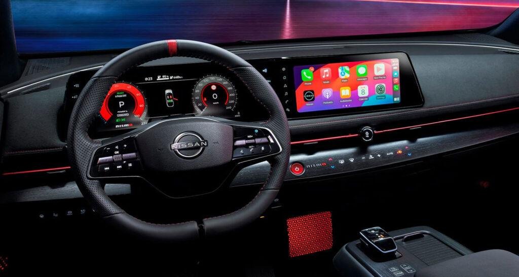 Al abrir la puerta, se aprecia que Nissan ha trabajado bien el ambiente interior. El Ariya ya destacaba por una presentación limpia y por una sensación de calidad sólida, y en Nismo se suma un punto de deportividad bien integrada. Los asientos específicos, con tapicería tipo suede y detalles en rojo, sujetan más el cuerpo y ayudan a que la postura de conducción sea más precisa. No son duros ni incómodos, incluso en trayectos largos, y la banqueta tiene una forma que evita esa fatiga típica cuando pasas horas al volante. El volante calefactable y el tacto de los mandos refuerzan esa sensación de coche bien rematado. La instrumentación se apoya en dos pantallas de 12,3 pulgadas, una para el cuadro y otra para el sistema multimedia, y en el uso real resultan fluidas y fáciles de entender. Apple CarPlay inalámbrico y Android Auto están disponibles, y el coche permite integrar navegación, música y llamadas sin complicaciones.