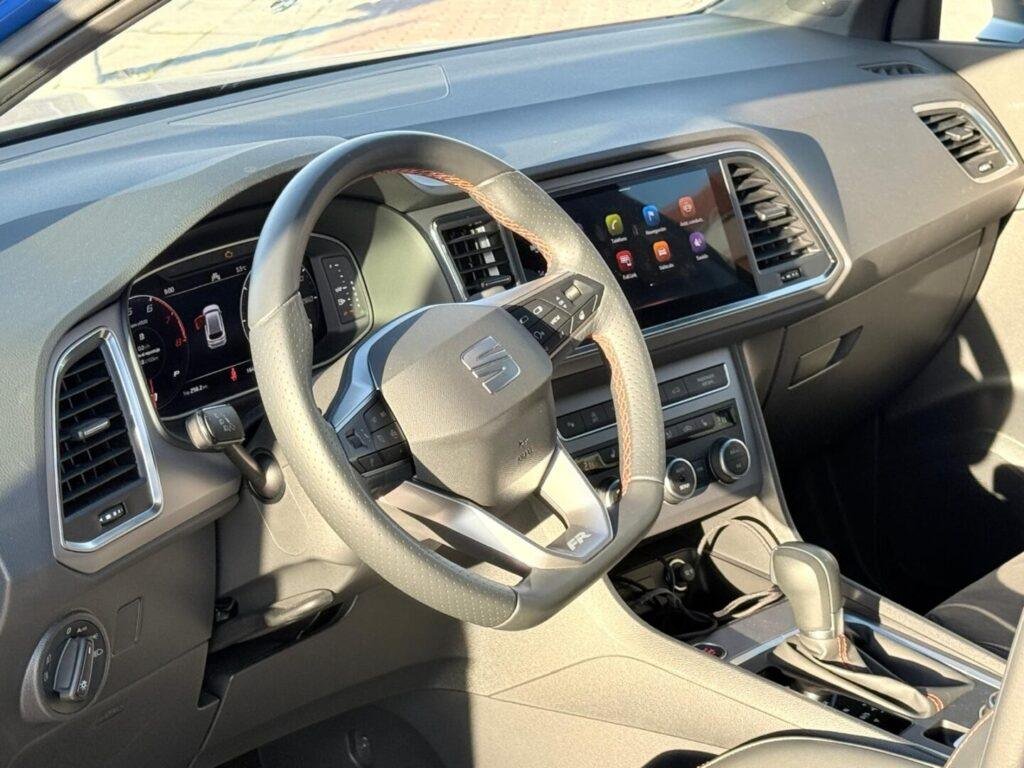 Abrir la puerta y sentarte es, para mí, el momento en el que un coche te dice si va a ser fácil convivir con él. En el Ateca todo cae a mano. Ajustas asiento y volante en segundos y enseguida encuentras la postura. Los asientos del FR sujetan bien sin ser agresivos, y eso se agradece porque hay días de ciudad, días de autovía y días de carreteras de curvas, y un asiento demasiado “racing” termina cansando. La calidad percibida está bien resuelta: las zonas de contacto tienen buen tacto, los ajustes se notan sólidos y, aunque hay plásticos duros en zonas bajas, no transmiten sensación de barato ni de fragilidad. Más importante aún, no escuché grillos ni crujidos con el coche frío o tras varias horas al sol, algo que en la vida real marca diferencias.