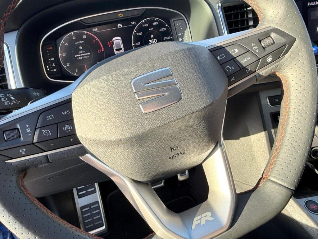 Abrir la puerta y sentarte es, para mí, el momento en el que un coche te dice si va a ser fácil convivir con él. En el Ateca todo cae a mano. Ajustas asiento y volante en segundos y enseguida encuentras la postura. Los asientos del FR sujetan bien sin ser agresivos, y eso se agradece porque hay días de ciudad, días de autovía y días de carreteras de curvas, y un asiento demasiado “racing” termina cansando. La calidad percibida está bien resuelta: las zonas de contacto tienen buen tacto, los ajustes se notan sólidos y, aunque hay plásticos duros en zonas bajas, no transmiten sensación de barato ni de fragilidad. Más importante aún, no escuché grillos ni crujidos con el coche frío o tras varias horas al sol, algo que en la vida real marca diferencias.